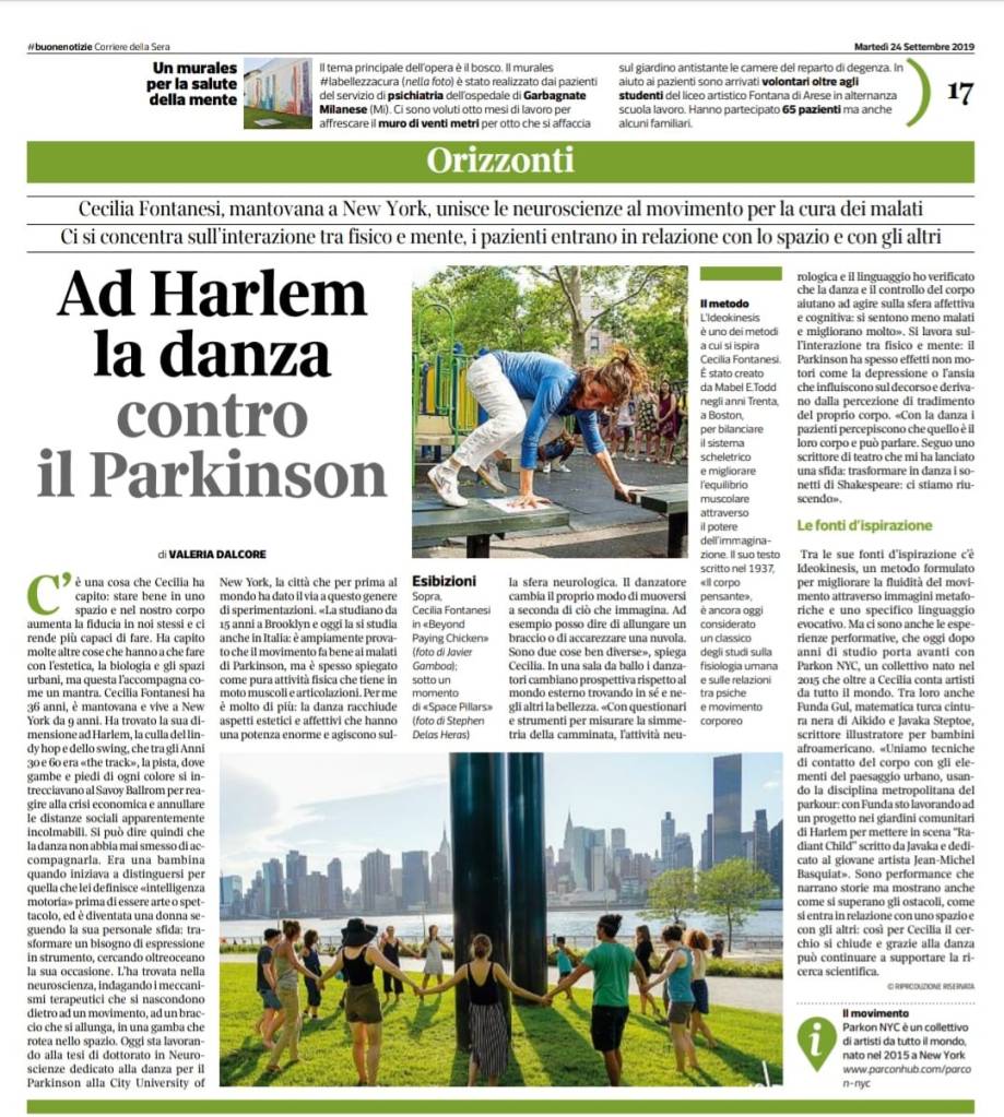 “Ad Harlem la danza contro il Parkinson” a profile feature of Cecilia Fontanesi by Valeria Dalcore writing for Il Corriere della Sera (2019)