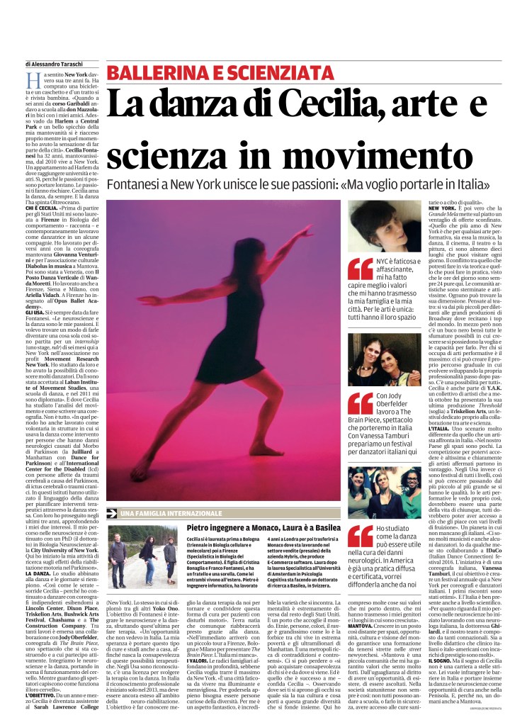 “La Danza di Cecilia: Arte e Scienza in Movimento” a profile feature of Cecilia Fontanesi by Andrea Taraschi writing for La Gazzetta di Mantova (2015)