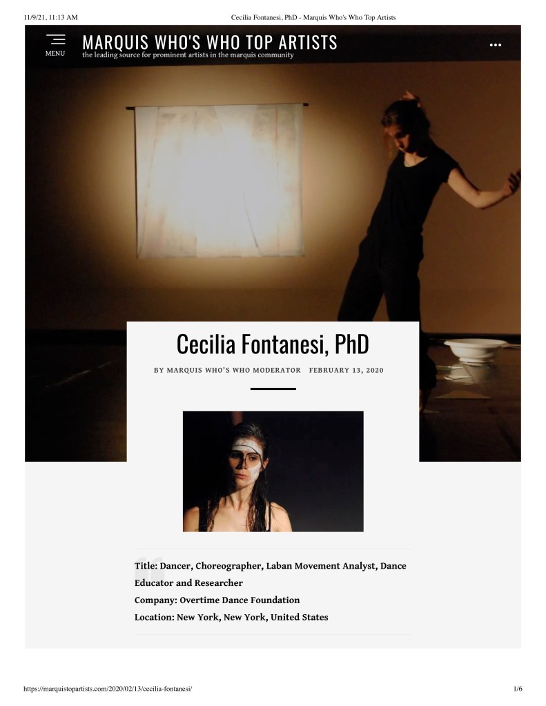 Cecilia Fontanesi, PhD – Marquis Who’s Who Top Artists: Who’s Who in America is a biographical dictionary about prominent living persons in the United States. Marquis Who’s Who was formed in 1898, and became widely regarded as the standard, authoritative work of contemporary biography in the United States.